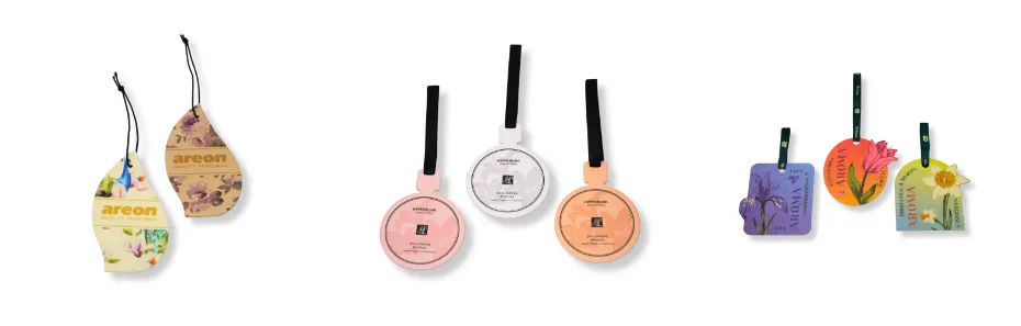 A paper air freshener uses absorbent paper as the base material, which is soaked with fragrance oil. It’s lightweight, affordable, and easily customizable in shape, color, and logo.