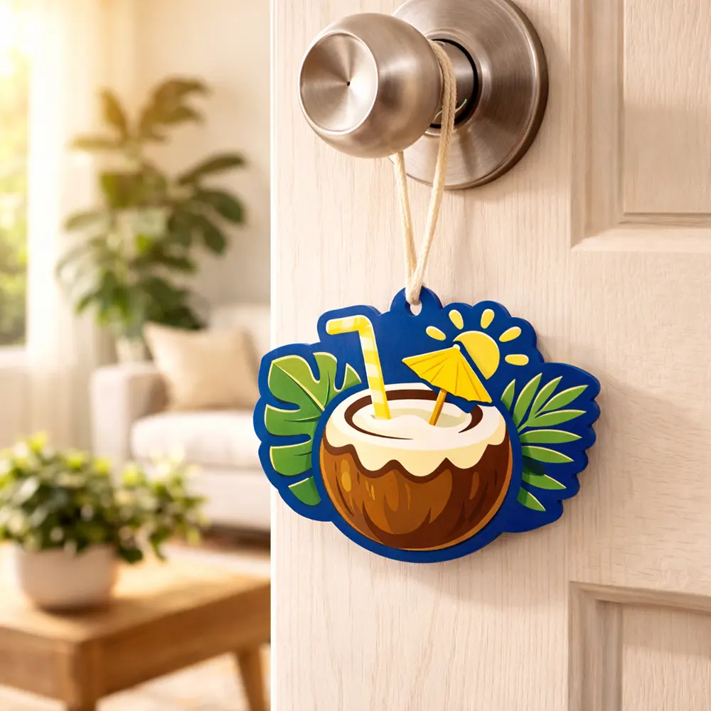 Description Bring a refreshing summer vibe to any space with this tropical coconut-shaped hanging air freshener. Featuring a vibrant design with a fresh coconut drink, palm leaves, and sunshine elements, it adds both fragrance and visual appeal. Made with a high-quality paper + sponge + paper layered structure, it ensures long-lasting scent diffusion. Perfect for ... Read more