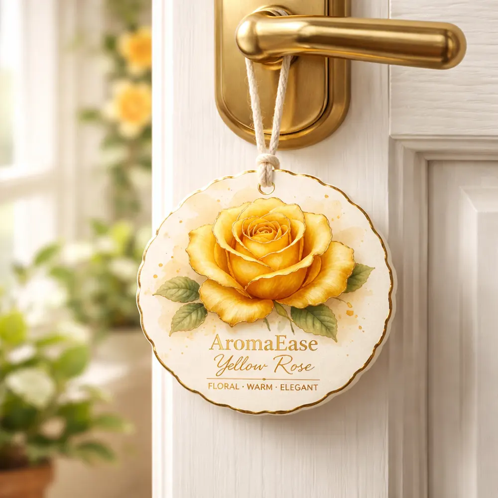 Description This beautifully crafted yellow rose hanging paper air freshener blends artistic design with a refined fragrance experience. Featuring a delicately illustrated golden rose with soft watercolor details and a premium scalloped edge, it delivers a sense of warmth, elegance, and sophistication. Made from high-quality absorbent paper with a 3-layer structure (Paper + Sponge + ... Read more