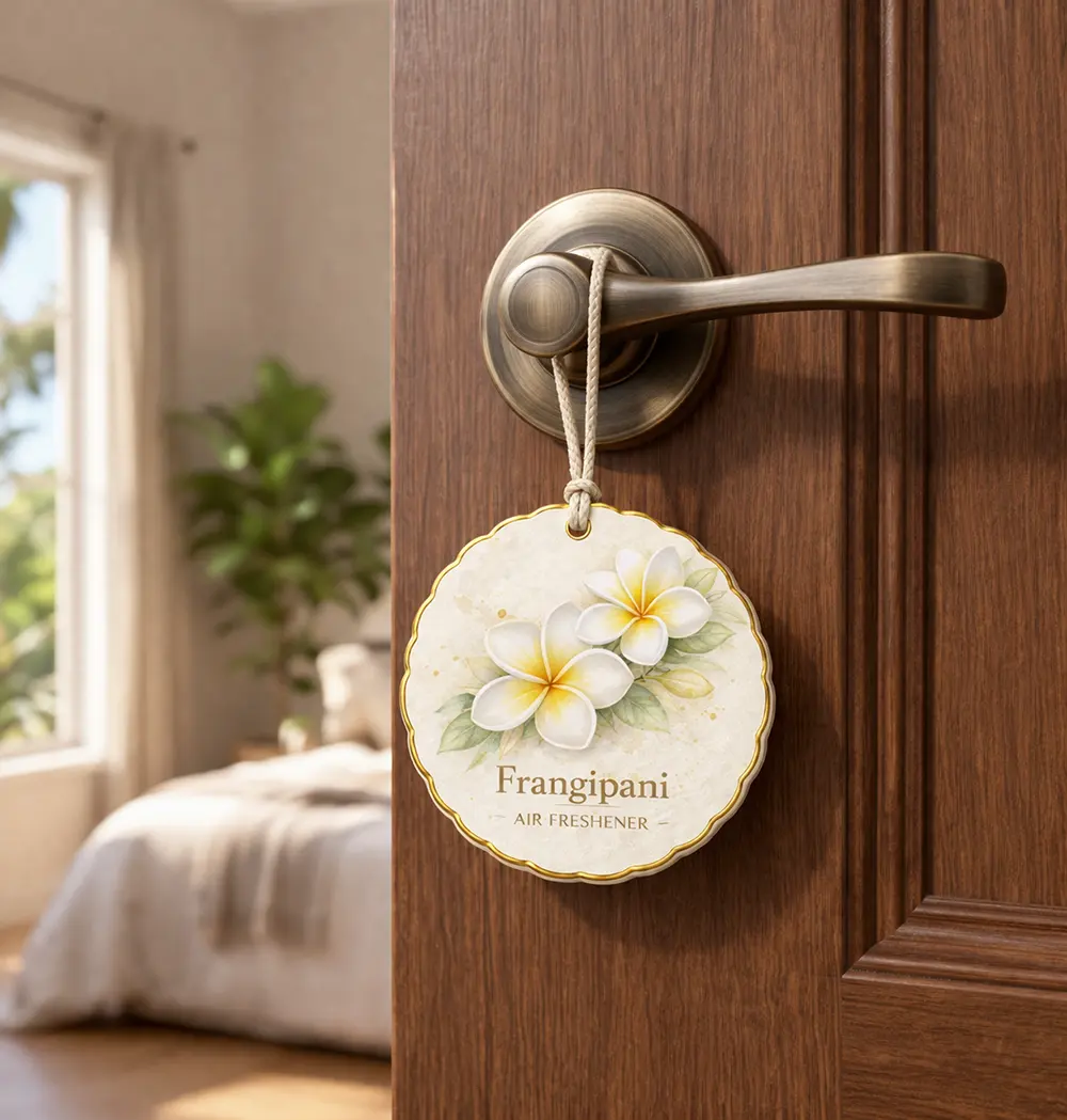 Description This elegant frangipani (plumeria) hanging paper air freshener features soft white petals with warm golden centers, capturing the essence of tropical serenity and natural beauty. The watercolor-style design combined with delicate gold edging creates a refined and premium visual appeal. Made from high-quality absorbent paper with a 3-layer structure (Paper + Sponge + Paper), ... Read more