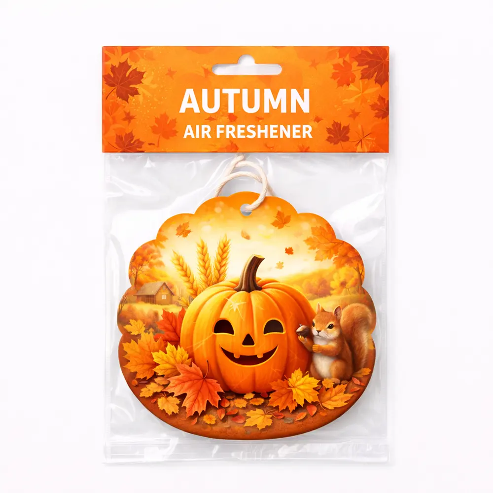 Create a warm and cozy atmosphere with this autumn-themed hanging air freshener, featuring a cheerful pumpkin surrounded by colorful maple leaves and a charming woodland scene. Designed to capture the essence of fall, it combines seasonal aesthetics with a pleasant, long-lasting fragrance. Made with a premium paper + sponge + paper layered structure, it ensures effective scent diffusion over time. Equipped with a natural cotton string for easy hanging, it is perfect for cars, wardrobes, offices, or home décor. Ideal for seasonal promotions, gift items, and custom OEM branding.