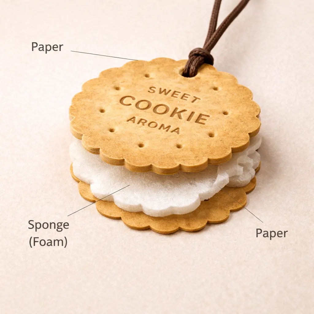 Made with a 3-layer structure (Paper + Sponge + Paper), it ensures a steady and long-lasting fragrance release for up to 30–45 days. The lightweight hanging design makes it perfect for use in kitchens, rooms, cars, or small spaces where a gentle and inviting scent is desired.