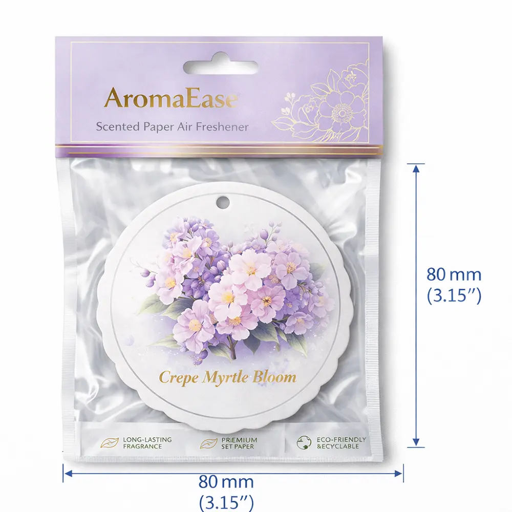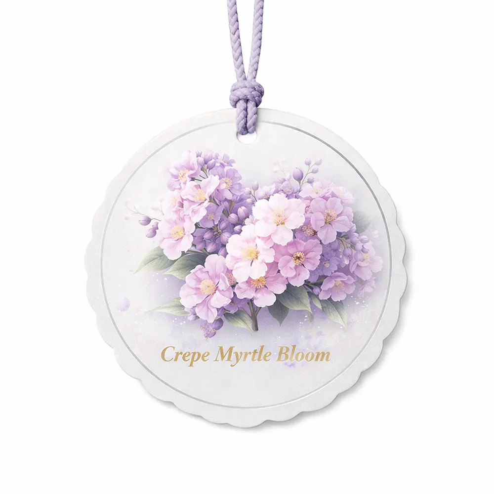A delicate and elegant hanging paper air freshener inspired by Crepe Myrtle blossoms, featuring soft purple floral artwork and a refined circular design. Crafted with a multi-layer paper structure, it slowly releases a gentle, long-lasting fragrance, creating a calm and refreshing atmosphere. Perfect for use in cars, closets, or small indoor spaces, this air freshener combines aesthetic beauty with functional scent diffusion, making it an ideal choice for both everyday use and premium gift or branding applications.