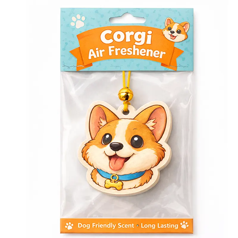 Celebrate everyday freshness with this adorable Corgi Hanging Paper Air Freshener. Featuring a cute and playful corgi design, each piece is crafted from premium absorbent paper and infused with long-lasting, natural-inspired fragrance.Perfect for car interiors, pet shops, cafés, or home decoration, this hanging air freshener adds a fun and lively touch to any space. Designed with a 3-layer structure (Paper + Sponge + Paper), it ensures a steady and balanced scent release.Fully customizable in shape, fragrance, and packaging, it is an ideal choice for brands, retailers, and promotional use.
