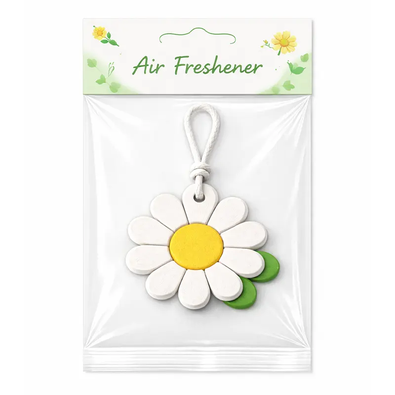 Celebrate everyday freshness with this charming Daisy Hanging Paper Air Freshener. Featuring a clean and elegant daisy design, each piece is crafted from premium absorbent paper and infused with long-lasting, natural-inspired fragrances.Perfect for car interiors, home decoration, or gift use, this hanging air freshener adds a fresh and decorative touch to any space. Designed with a 3-layer structure (Paper + Sponge + Paper), it ensures a steady and balanced fragrance release.Fully customizable in shape, scent, and packaging, it is an ideal choice for brands, retailers, and seasonal collections.