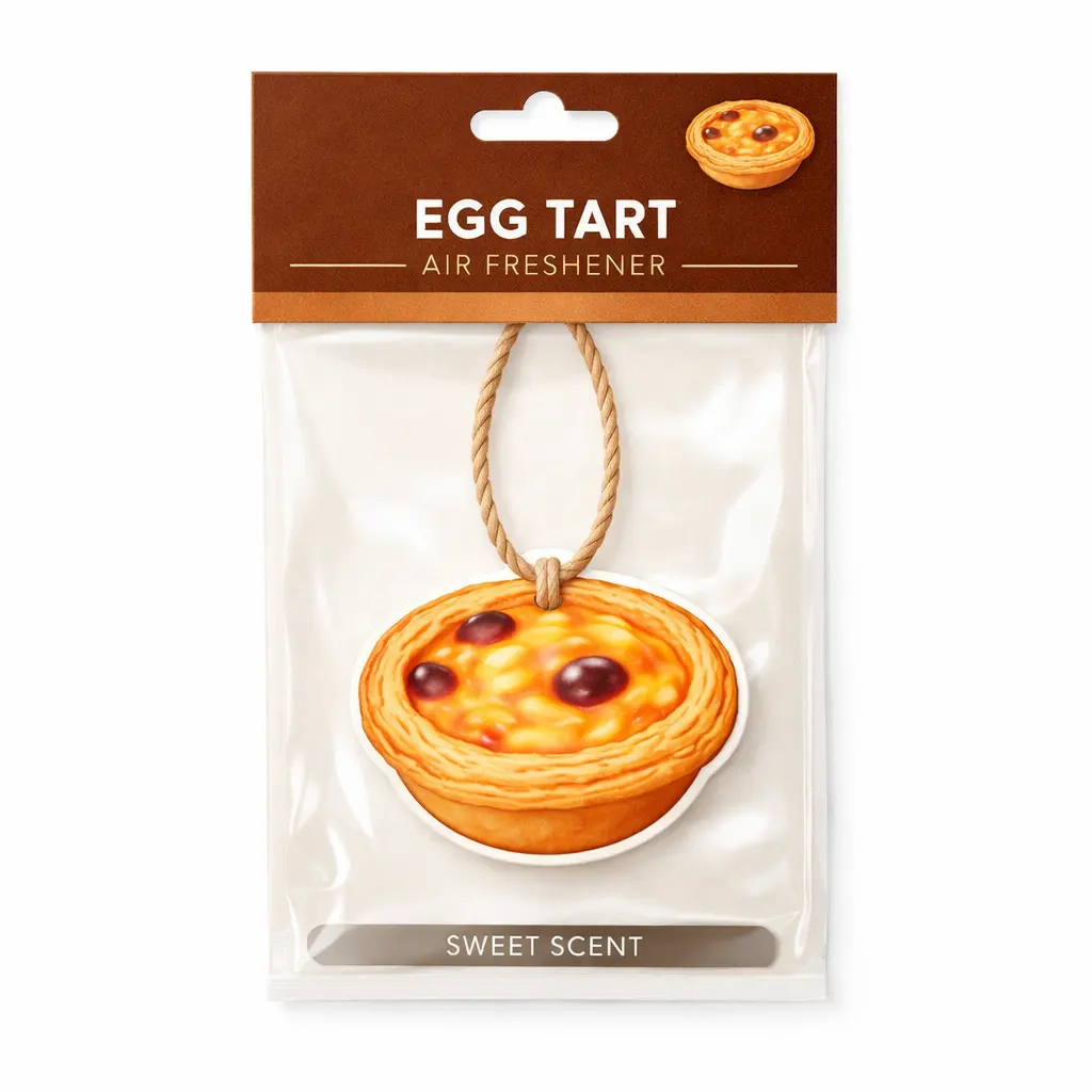 Celebrate everyday freshness with this delightful Egg Tart Hanging Paper Air Freshener. Inspired by the classic dessert, this unique pastry-shaped design adds a warm and eye-catching touch to any space. Each piece is crafted from premium absorbent paper and infused with long-lasting, sweet-inspired fragrances for a comforting aroma experience.Perfect for car interiors, kitchens, home decoration, gift sets, or promotional use, this hanging air freshener brings both charm and freshness to everyday environments. Fully customizable in shape, scent, and packaging, it is an ideal choice for brands, retailers, and seasonal collections.