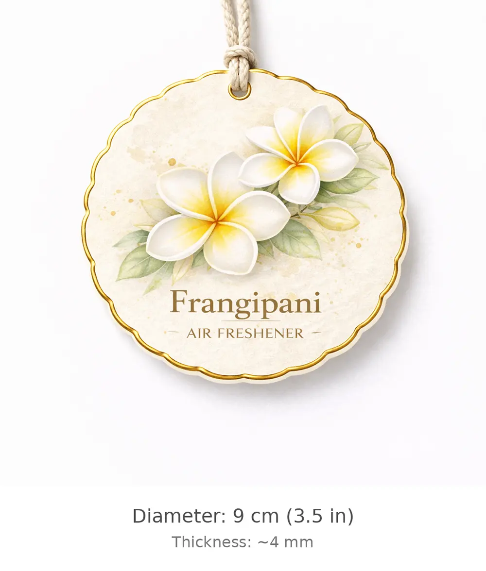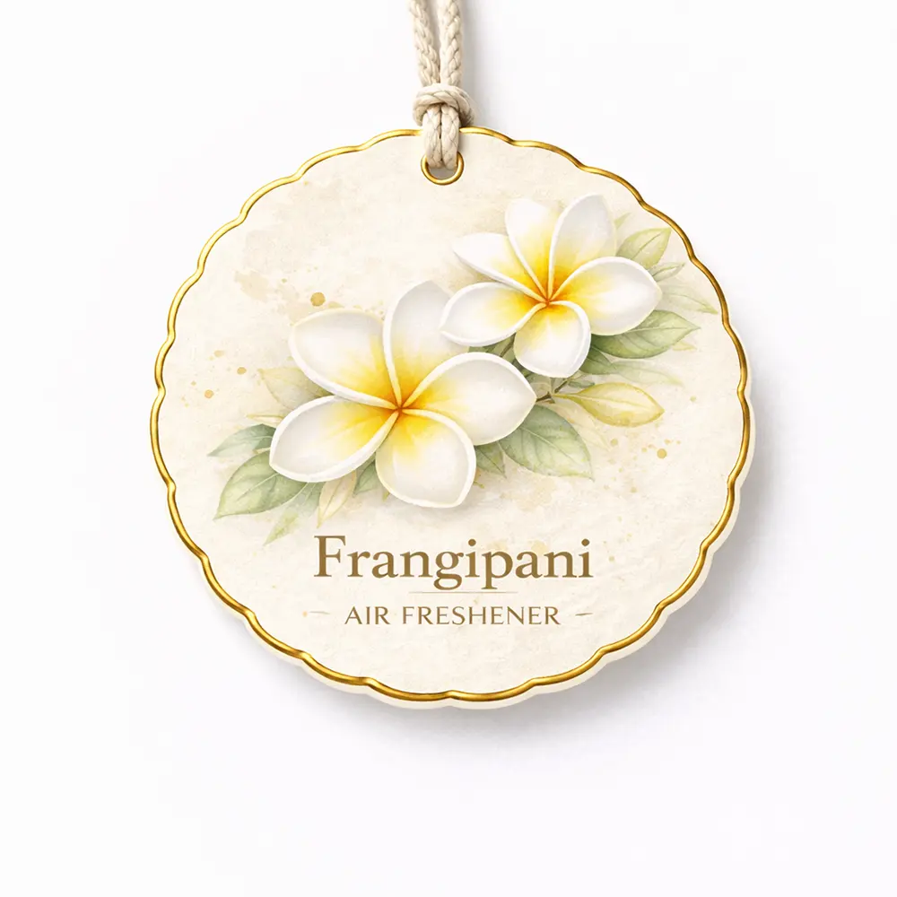This elegant frangipani (plumeria) hanging paper air freshener features soft white petals with warm golden centers, capturing the essence of tropical serenity and natural beauty. The watercolor-style design combined with delicate gold edging creates a refined and premium visual appeal.