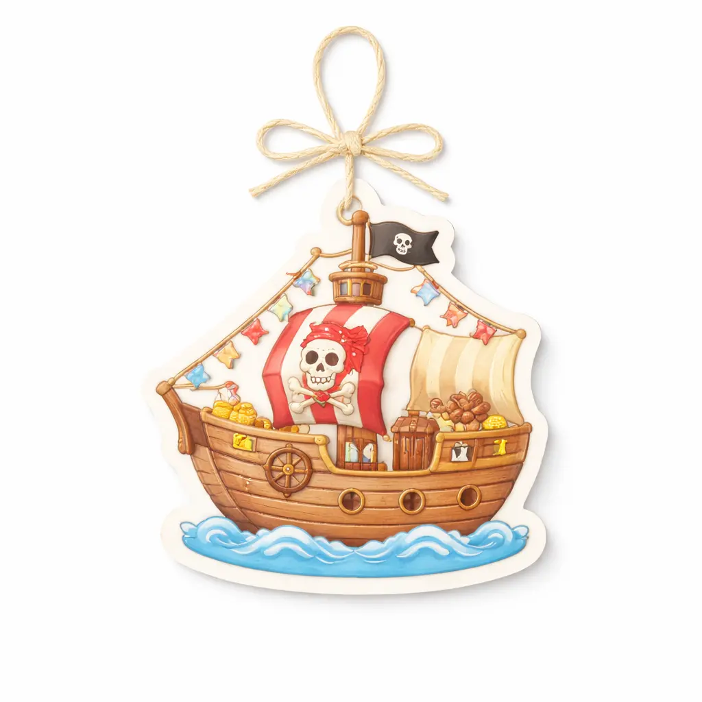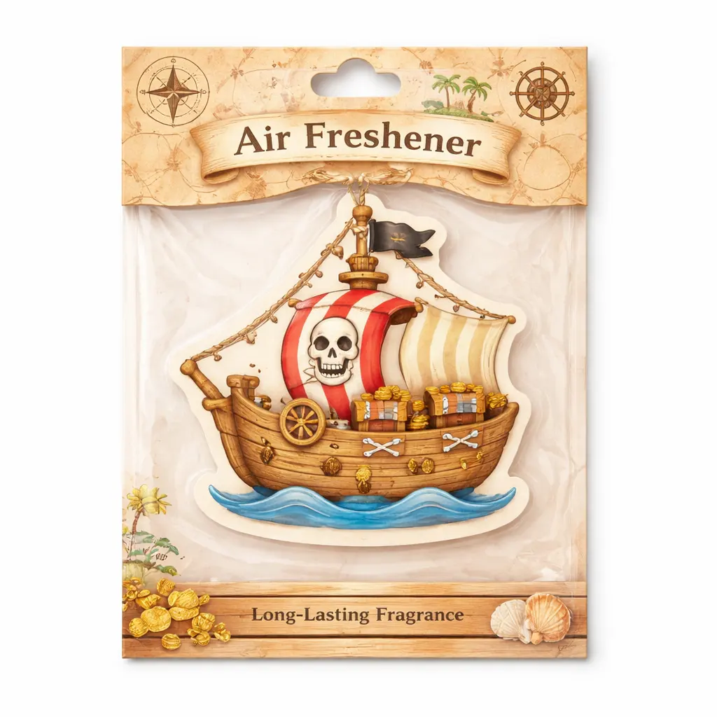 Bring a playful and adventurous vibe to your space with this pirate ship hanging paper air freshener. Designed with a detailed cartoon ship and treasure theme, it adds a unique decorative touch while delivering a refreshing fragrance.