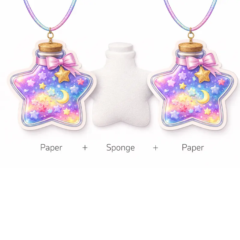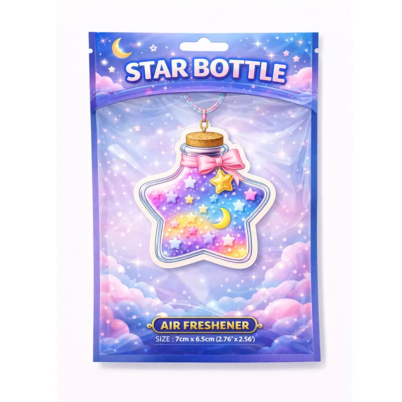 Celebrate a dreamy and refreshing atmosphere with this charming Star Bottle Paper Air Freshener. Featuring a colorful galaxy-inspired design with stars and moon elements, each piece is crafted from premium absorbent paper and infused with long-lasting, gentle fragrances.Perfect for closets, rooms, offices, or gift use, this hanging air freshener adds both a pleasant scent and a decorative touch to any space. Fully customizable in shape, scent, and packaging, it is ideal for brands, retailers, and seasonal collections.