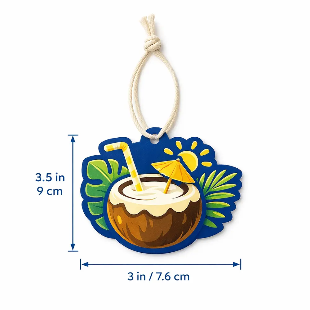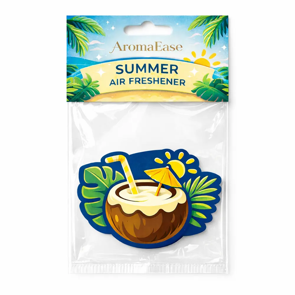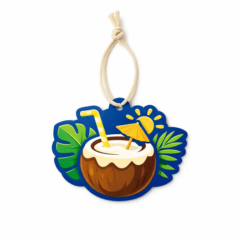 Bring a refreshing summer vibe to any space with this tropical coconut-shaped hanging air freshener. Featuring a vibrant design with a fresh coconut drink, palm leaves, and sunshine elements, it adds both fragrance and visual appeal. Made with a high-quality paper + sponge + paper layered structure, it ensures long-lasting scent diffusion. Perfect for use in cars, wardrobes, offices, or small indoor spaces, this lightweight air freshener comes with a natural cotton string for easy hanging. Ideal for OEM customization, gift items, and seasonal promotions.
